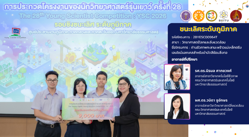 โครงการ วมว.มธ.-สกร. ขอแสดงความยินดีกับนักเรียนและอาจารย์ที่ปรึกษาที่ได้รับรางวัล ในการประกวดโครงงานของนักวิทยาศาสตร์รุ่นเยาว์ ครั้งที่ 28 (Young Scientist Competition: YSC 2026) รอบชิงชนะเลิศระดับภูมิภาค (ภาคกลางและภาคตะวันออก) วันที่ 4 มกราคม 2569 สำนักงานพัฒนาวิทยาศาสตร์และเทคโนโลยีแห่งชาติ (สวทช.) ร่วมกับ คณะวิศวกรรมศาสตร์ มหาวิทยาลัยธรรมศาสตร์ จัดงานประกวดโครงงานของนักวิทยาศาสตร์รุ่นเยาว์ ครั้งที่ 28 (Young Scientist Competition: YSC 2026) รอบชิงชนะเลิศระดับภูมิภาค (ภาคกลางและภาคตะวันออก) ณ อาคารเรียนรวมสังคมศาสตร์ 3 (SC3) มหาวิทยาลัยธรรมศาสตร์ ศูนย์รังสิต เพื่อส่งเสริมให้เยาวชนไทยได้แสดงศักยภาพในการคิดค้นนวัตกรรมและใช้กระบวนการทางวิทยาศาสตร์ในการแก้ไขปัญหาสังคมทั้งในระดับท้องถิ่นและระดับชาติ โดยในปีนี้นักเรียนชั้นมัธยมศึกษาปีที่ 5 (รุ่น 10) โครงการ วมว.มธ.-สกร. ได้รับรางวัลจากการแข่งขันทั้งสิ้น 5 รางวัล ได้แก่ รางวัลชนะเลิศระดับภูมิภาค 2 รางวัล รหัสโครงการ : 28YESC00964T สาขา : วิทยาศาสตร์โลกและสิ่งแวดล้อม ชื่อโครงการ :…