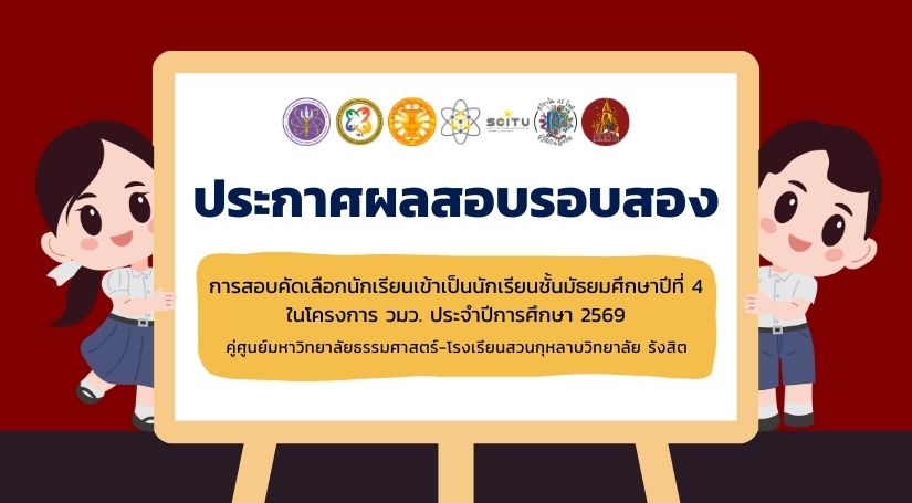 ประกาศกระทรวงการอุดมศึกษา วิทยาศาสตร์ วิจัยและนวัตกรรม เรื่อง ผลการสอบคัดเลือกนักเรียนเพื่อเข้าเป็นนักเรียนชั้นมัธยมศึกษาปีที่ 4 ใน “โครงการห้องเรียนวิทยาศาสตร์ในโรงเรียน โดยการกำกับดูแลของมหาวิทยาลัย ระยะที่ 3” ของกระทรวงการอุดมศึกษา วิทยาศาสตร์ วิจัยและนวัตกรรม ประจำปีการศึกษา 2569 คู่ศูนย์มหาวิทยาลัยธรรมศาสตร์ – โรงเรียนสวนกุหลาบวิทยาลัย รังสิต ดาวน์โหลดประกาศฯ คลิก >> https://drive.google.com/file/d/1Aa1-eCHOMMXEumW80IT6IVXqylCvCGLn/view?usp=sharing เอกสารแนบท้าย 1 : รายชื่อผู้ผ่านการสอบคัดเลือกรอบสอง ดาวน์โหลด เอกสารแนบท้าย 1 คลิก >> https://drive.google.com/file/d/1Pdpj9x2OPcVlvnmua2QjKHMZpvm6Vf4n/view?usp=sharing เอกสารแนบท้าย 2 : กำหนดการรายงานตัวและการมอบตัว ดาวน์โหลด เอกสารแนบท้าย 2 คลิก >> https://drive.google.com/file/d/1qfW4oUCmtfqxEryNl9iQqU3reLD-4hOa/view?usp=sharing เอกสารแนบท้าย 3 : บัญชีรายชื่อผู้ได้รับการคัดเลือกอันดับสำรองบัญชีตัวสำรองส่วนกลาง ดาวน์โหลด เอกสารแนบท้าย 3 คลิก >> https://drive.google.com/file/d/1WNwJoTumVry8N0XL0rj_qsdJcV7Di67J/view เอกสารแนบท้าย 4 : สถานที่ขอดูคะแนนสอบ (สำหรับผู้ที่ไม่ผ่านการสอบคัดเลือกตัวจริงและตัวสำรอง) ดาวน์โหลด เอกสารแนบท้าย 4 คลิก…