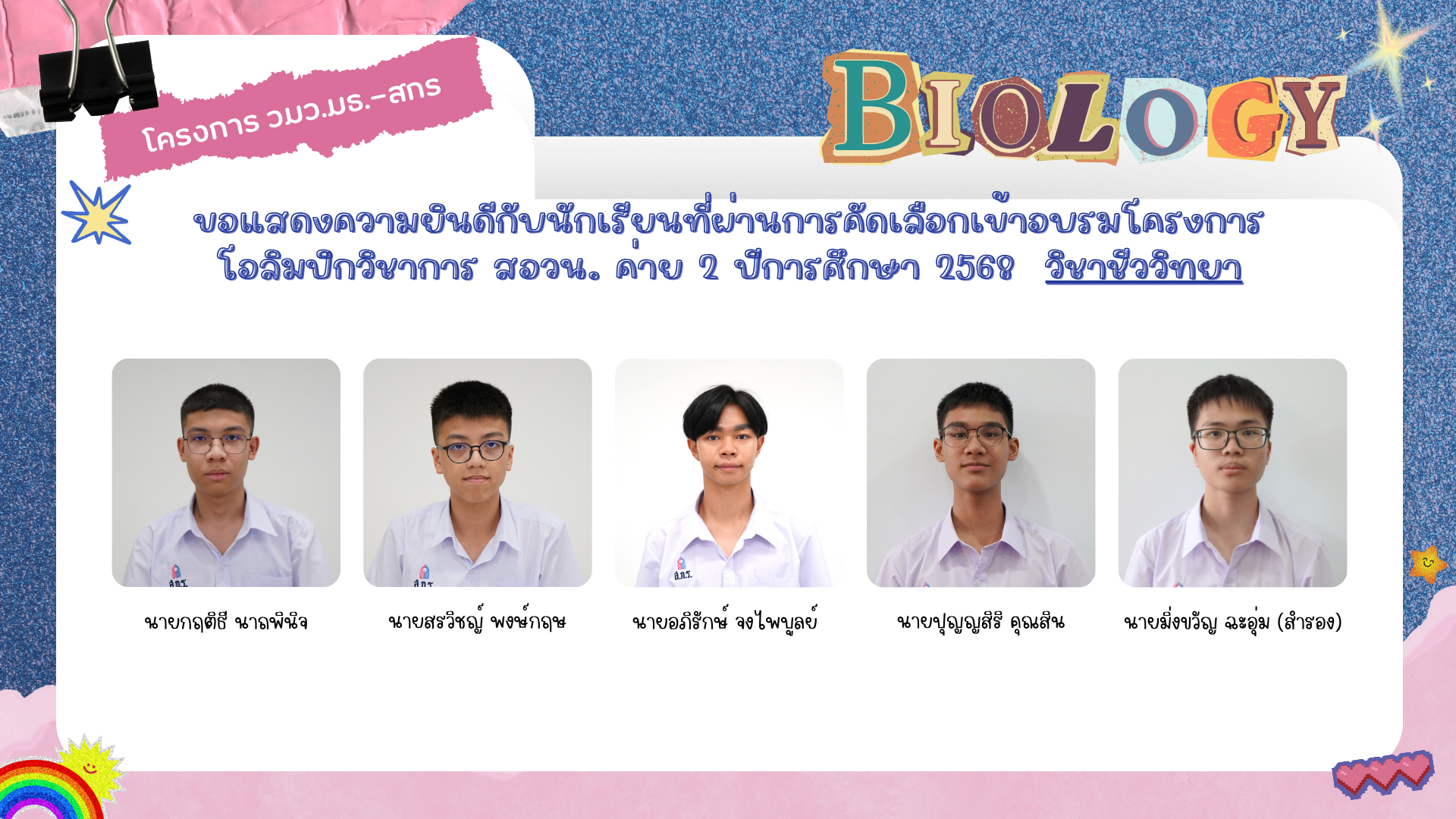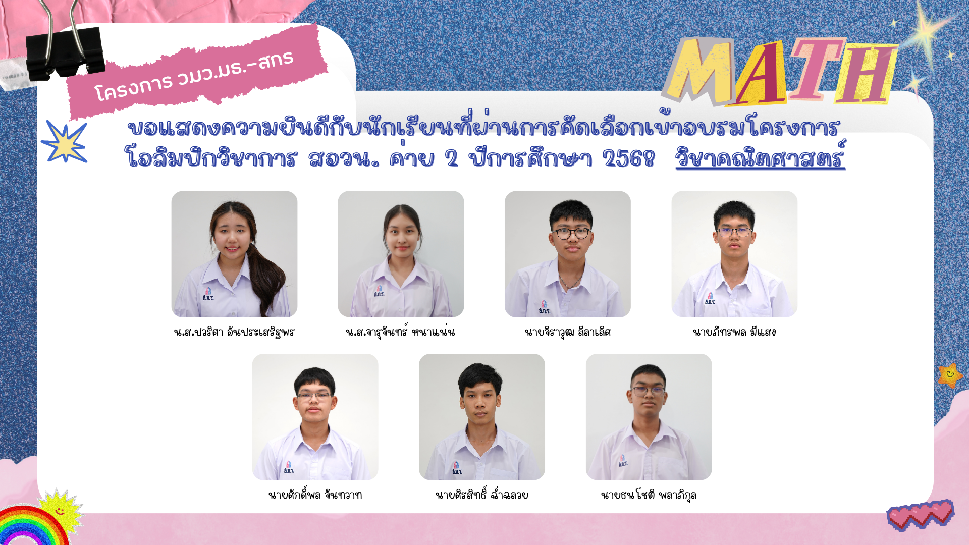 โดยในปีการศึกษา 2568 มีนักเรียนโครงการ วมว.มธ.-สกร. ชั้นมัธยมศึกษาปีที่ 4 (รุ่น 11) และ ชั้นมัธยมศึกษาปีที่ 5 (รุ่น 10) ผ่านการสอบคัดเลือกเพื่อเข้าอบรมในโครงการโอลิมปิกวิชาการ (สอวน.) ค่าย 2 จำนวน 43 คน ดังนี้