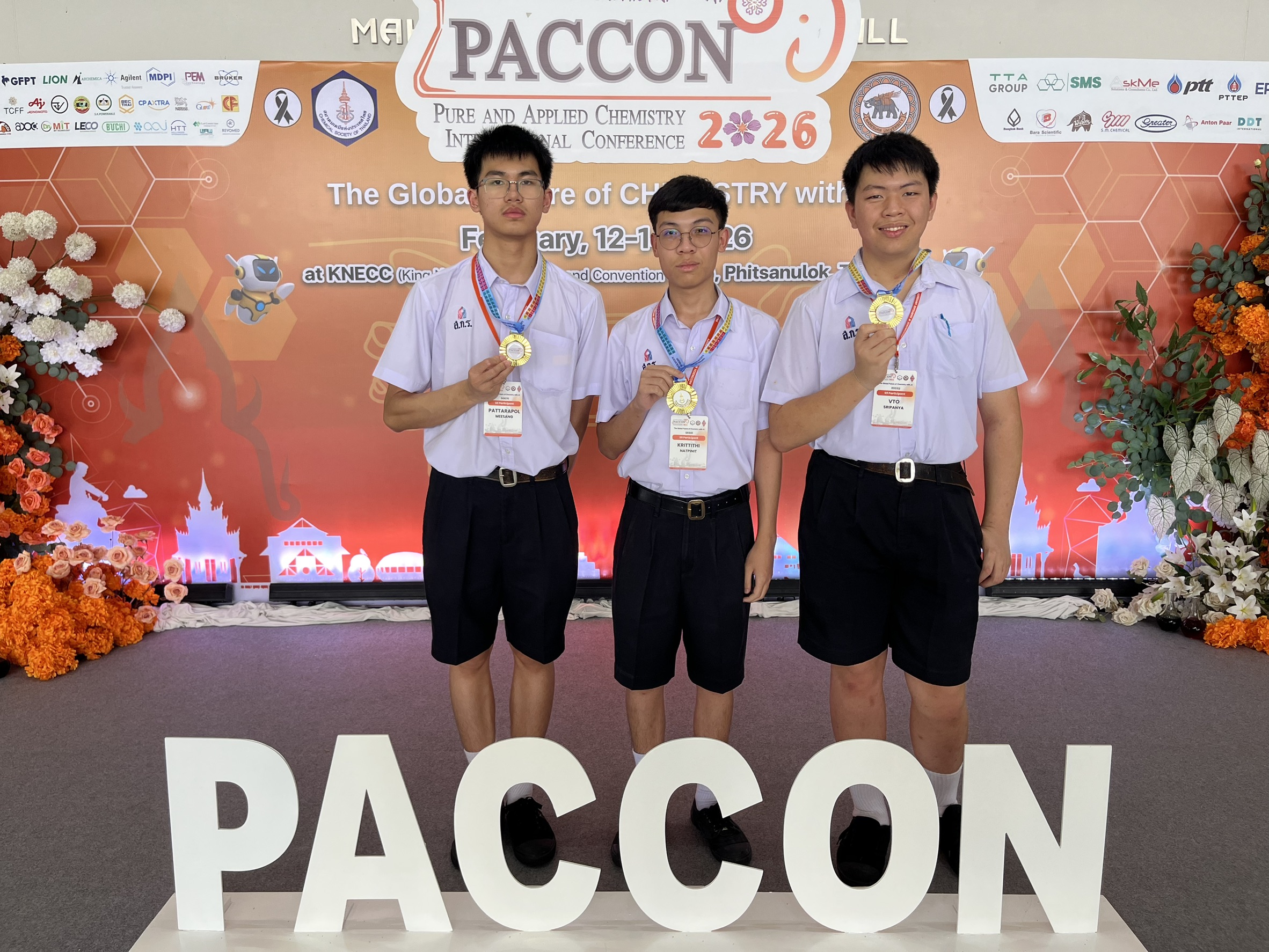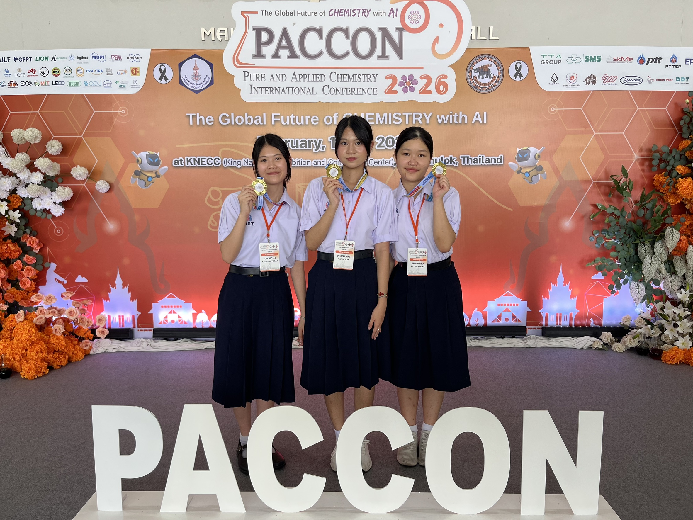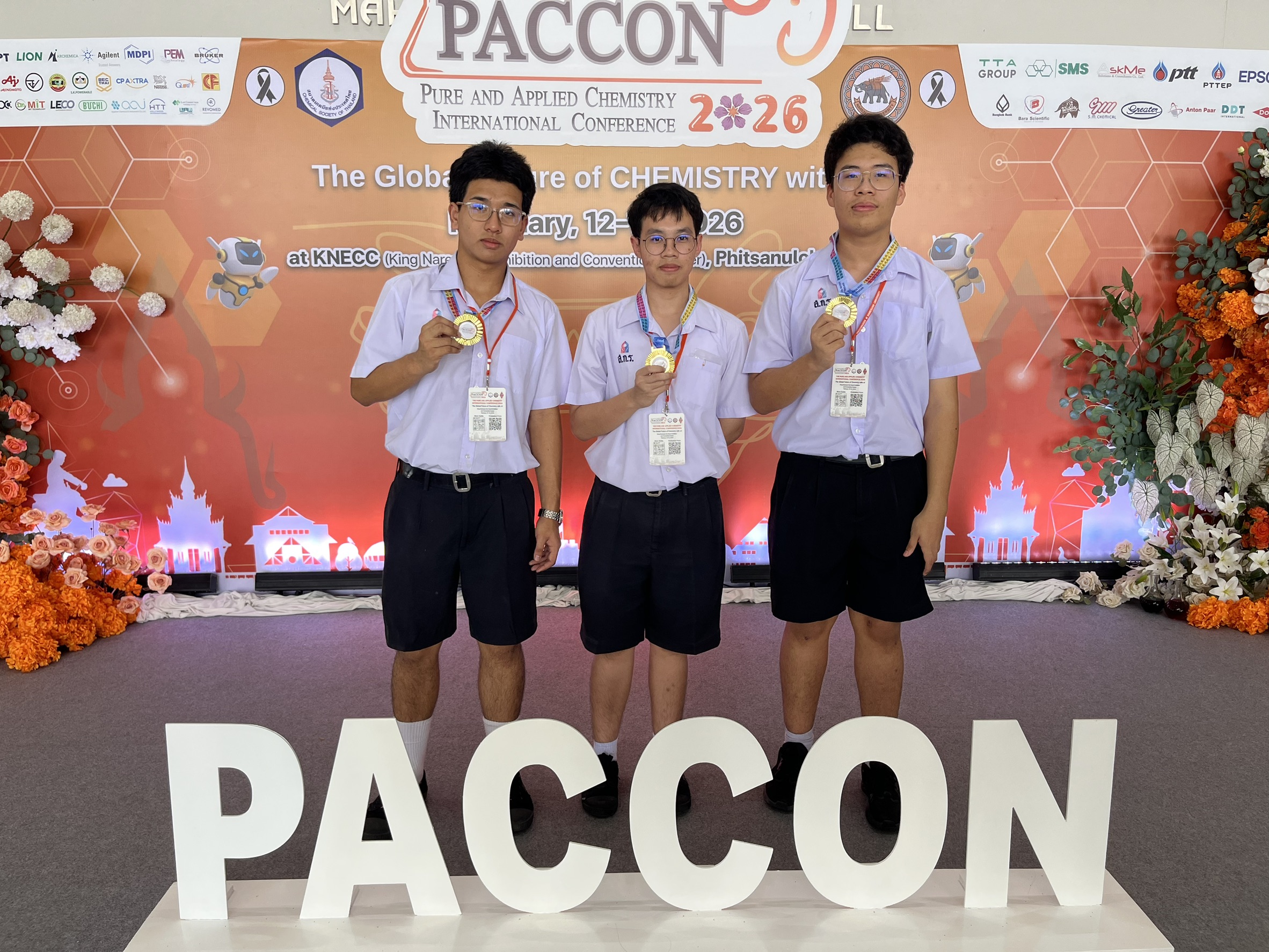 โครงการ วมว.มธ.-สกร. ขอแสดงความยินดีกับนักเรียนชั้น ม.5 (รุ่น 10) ที่ได้รับรางวัลเหรียญทอง จากการแข่งขันโครงงานวิทยาศาสตร์ ในงาน The 3rd Science Projects in Schools Showcase at PACCON2026 เมื่อวันที่ 13 กุมภาพันธ์ 2569 ณ ศูนย์แสดงนิทรรศการและการจัดประชุมนานาชาติสมเด็จพระนเรศวรมหาราช (KNECC) มหาวิทยาลัยนเรศวร